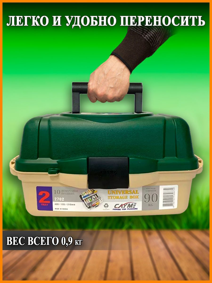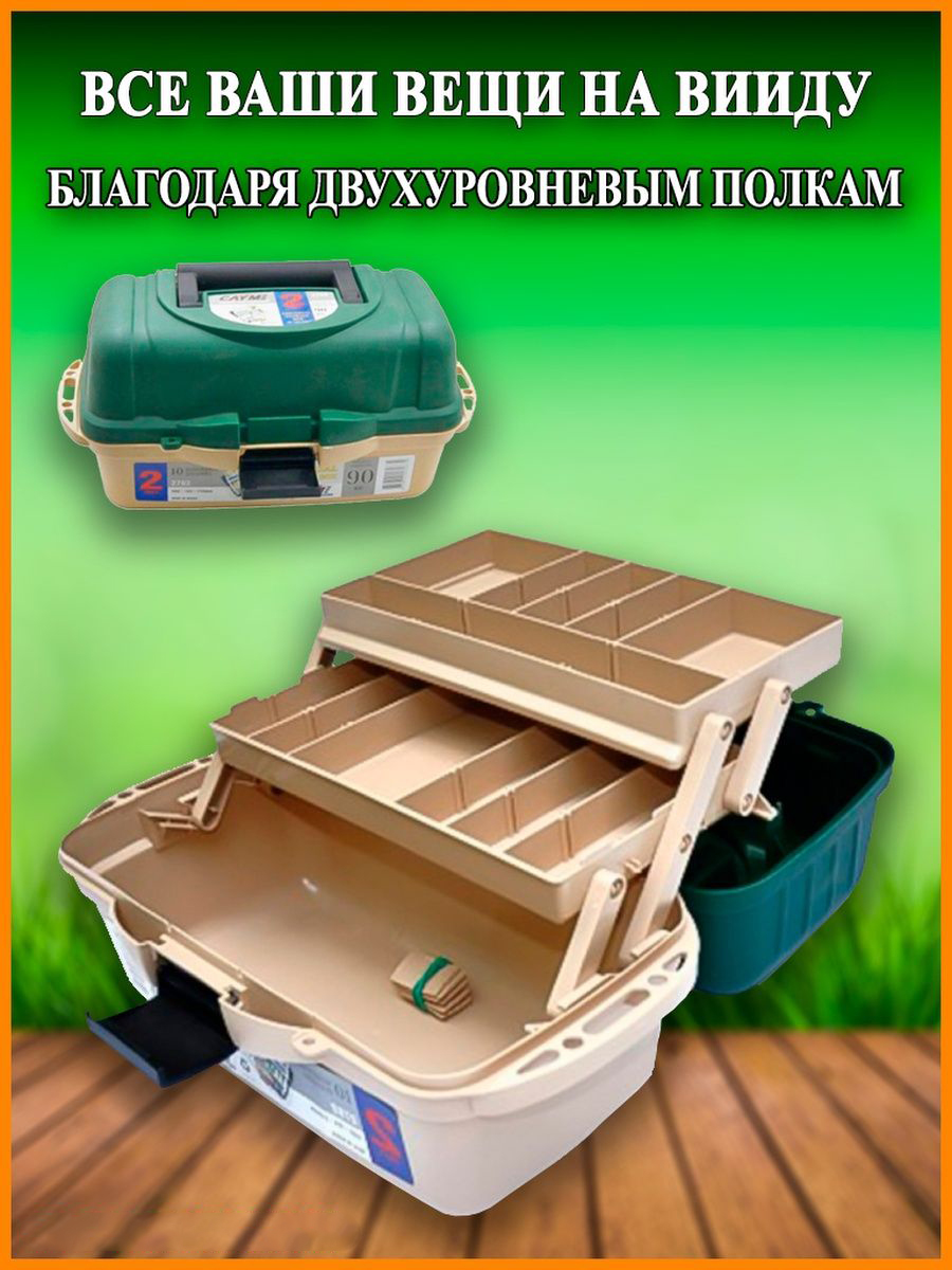 Удобный и вместительный ящик с двумя выдвижными полками для различной рыболовной оснастки: поплавков, приманок и другой полезной мелочи. На дно ящика можно положить 1-3 спиннинговых катушек. Материал: ударопрочный полипропилен. Вмещает в себя большое количество разнообразной оснастки.
